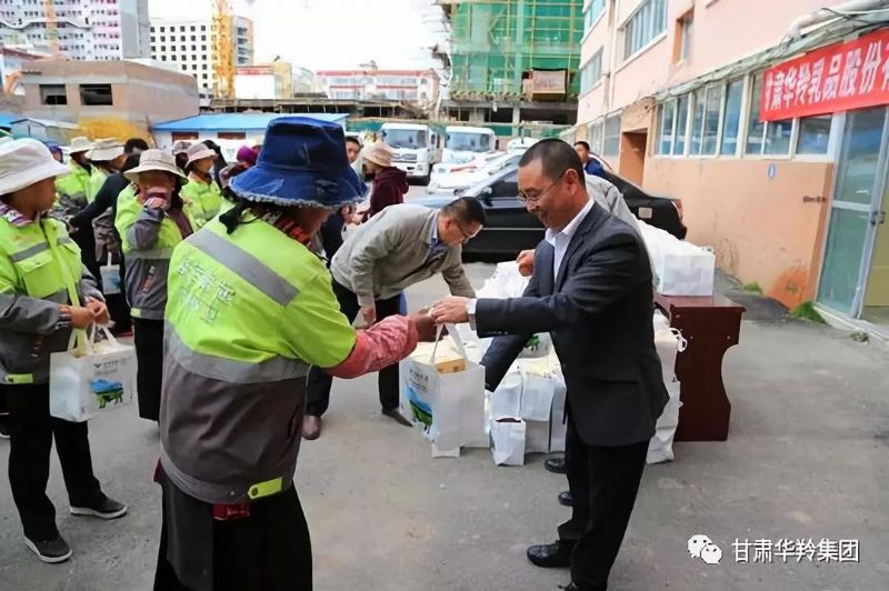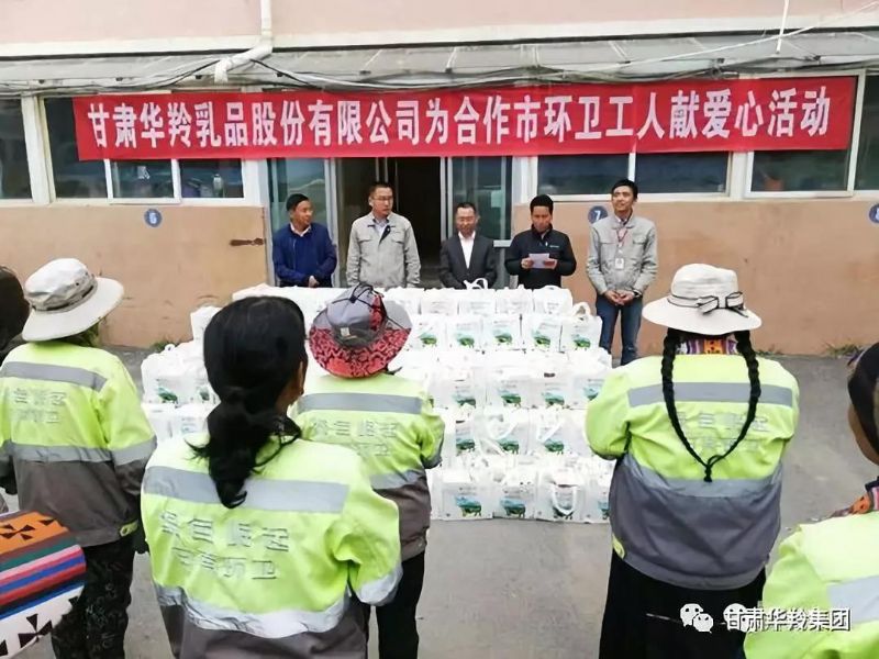 甘肅華羚乳品股份有限公司為合作市環衛工送去了公司生產的牦牛乳奶粉、牦牛乳酥油茶等總價值58000元的節日慰問品,合作市生態產業園管委會主任周文,合作市綜合執法局局長劉尕萬出席了此次活動,公司副總經理馬小平代表公司在活動現場為環衛工們送去了節日的問候,并發放了慰問禮品,祝愿環衛工身體健康,節日快樂!