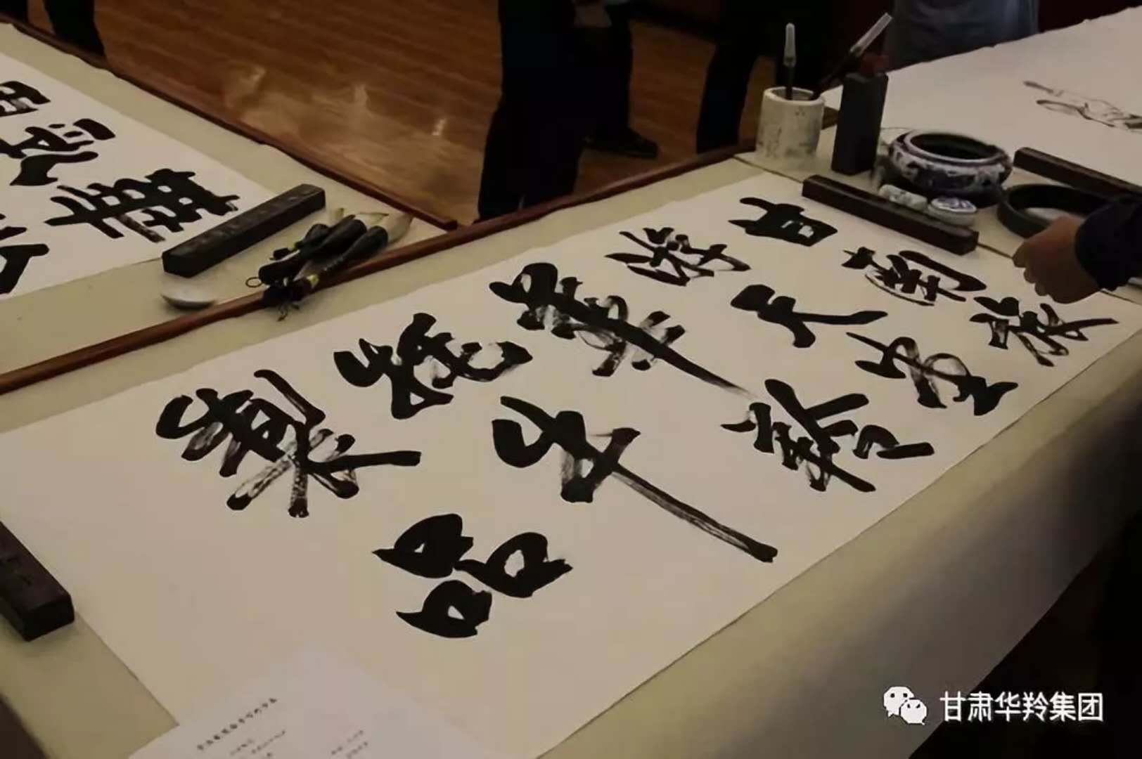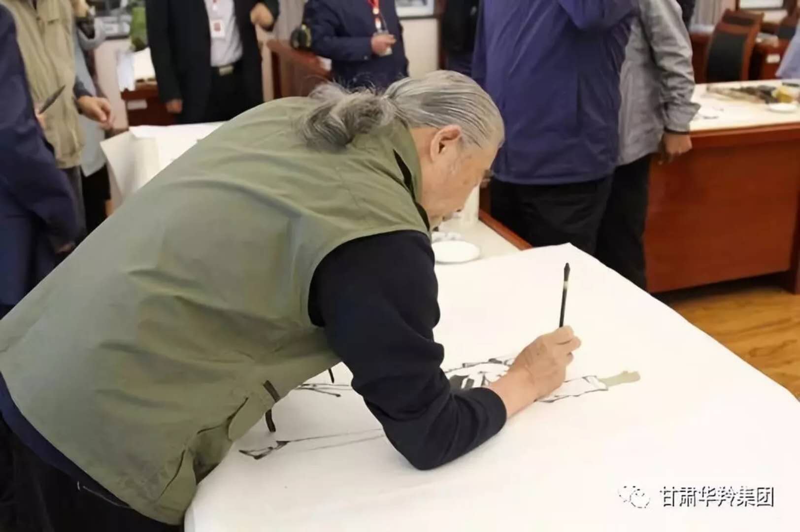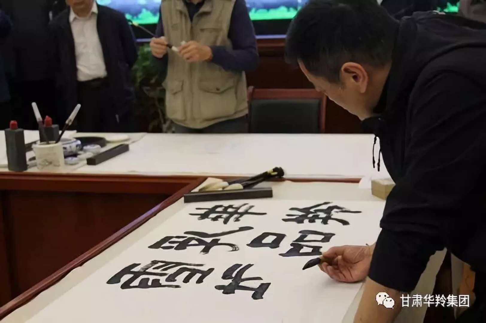 在華羚乳品公司四樓會議接待室,梅凱副院長,周明安委員,常銘主席等著名書畫家現場揮毫潑墨,場面熱鬧非凡,其樂融融。