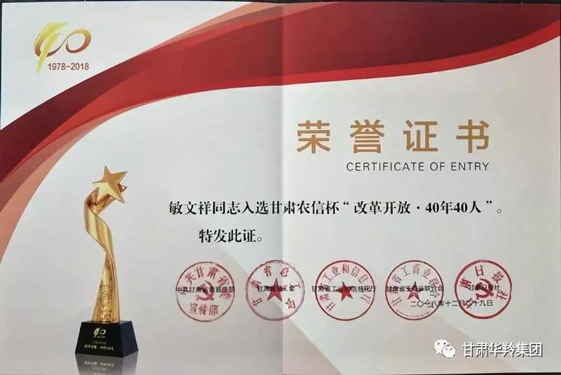 2018年12月29日,甘肅省改革開放•40年40人表彰儀式在甘肅省大劇院隆重舉行,甘肅華羚實業集團董事長敏文祥等40人受到表彰,被授予“改革開放•40年40人”榮譽稱號。甘肅華羚實業集團董事長是甘南州唯一獲此殊榮者。